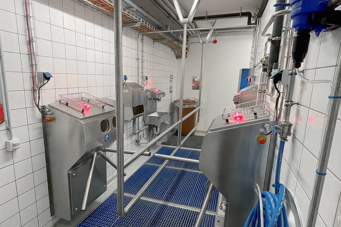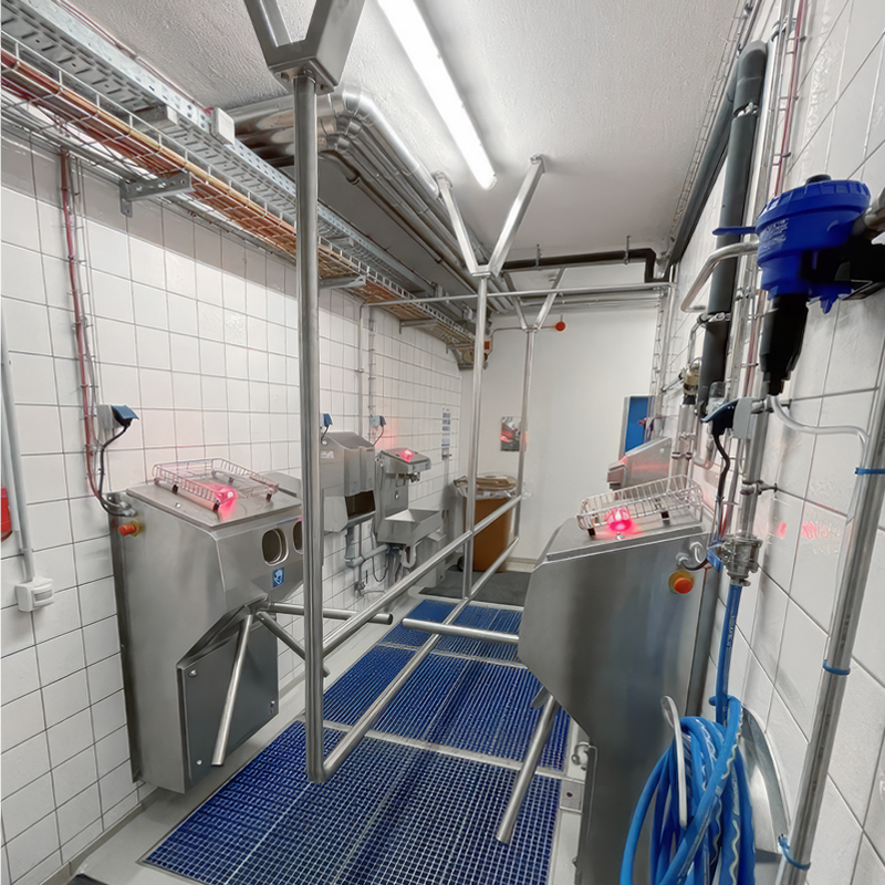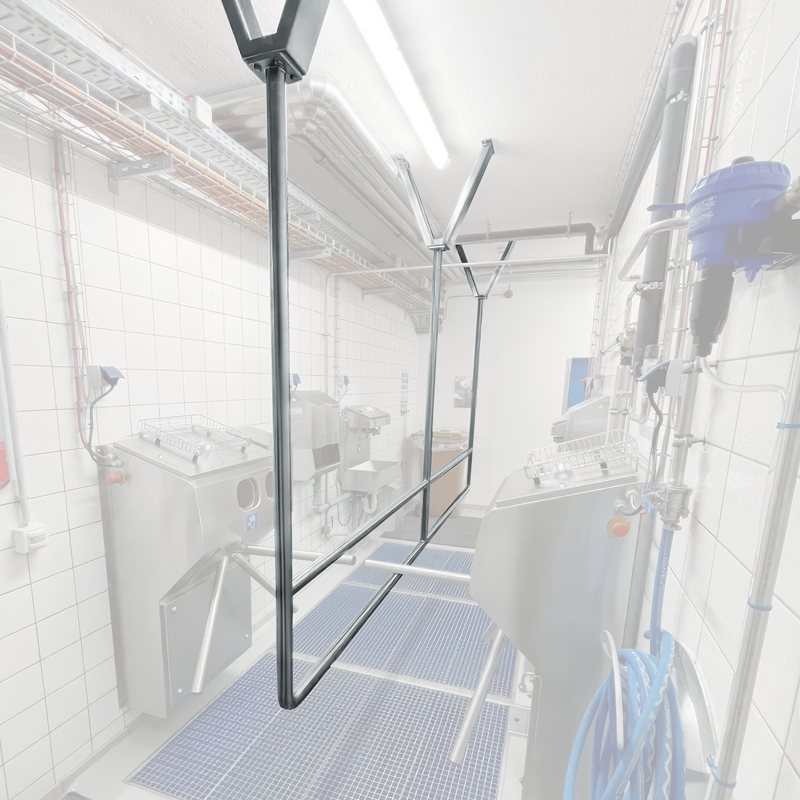 Particularly in hygiene-sensitive production environments, the stainless steel ceiling railing offers a functional way of guiding the flow of personnel without having to reach into the floor.