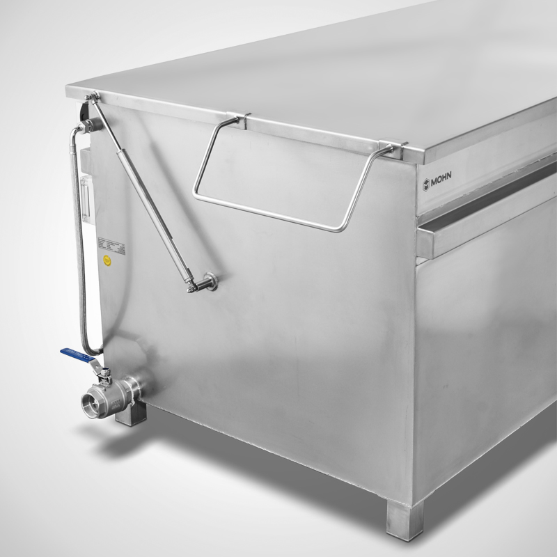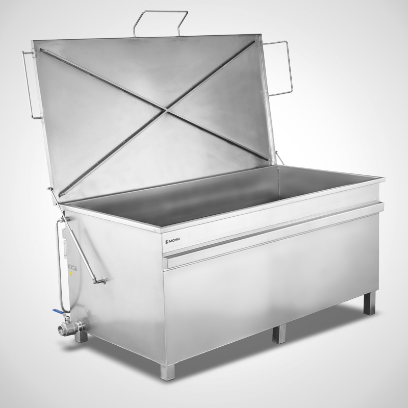 The hinged lid with gas pressure dampers on one side makes it easy to open and close, while the all-round, tightly welded reinforcing rim additionally stabilises the construction. For safe, reproducible emptying, the bowl is designed with a defined slope to the left-hand drain; the external DN50 outlet with ball valve is easily accessible. The Siemens logo control system enables automatic filling with sensor switch-off.