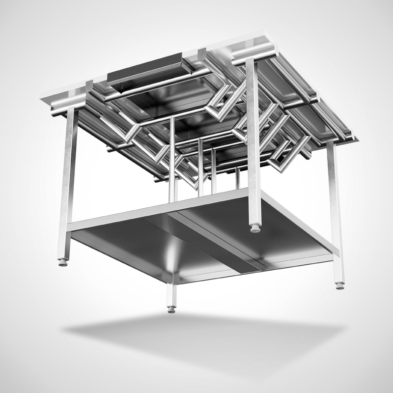 - Edelstahl-Tischplatte unterhalb mit umlaufendem Quadratrohr-Profilrahmen verstärkt