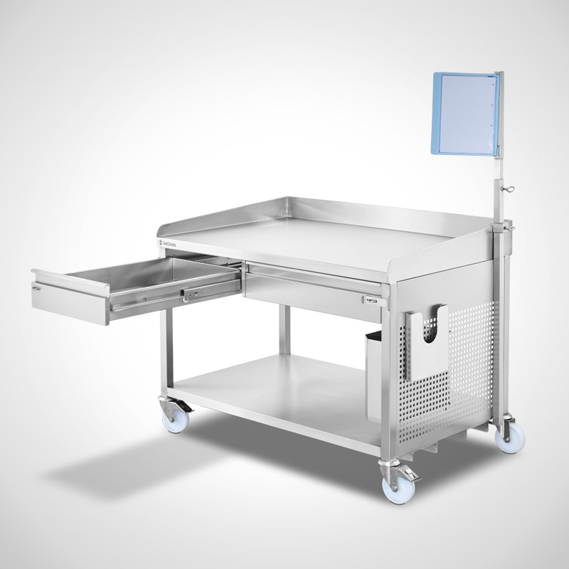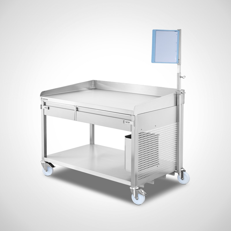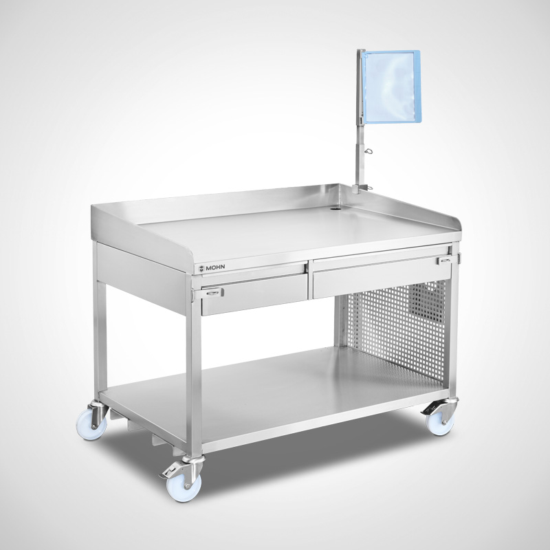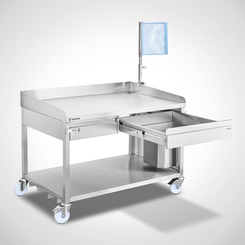 fahrbarer edelstahl-arbeitstisch zur warenprüfung