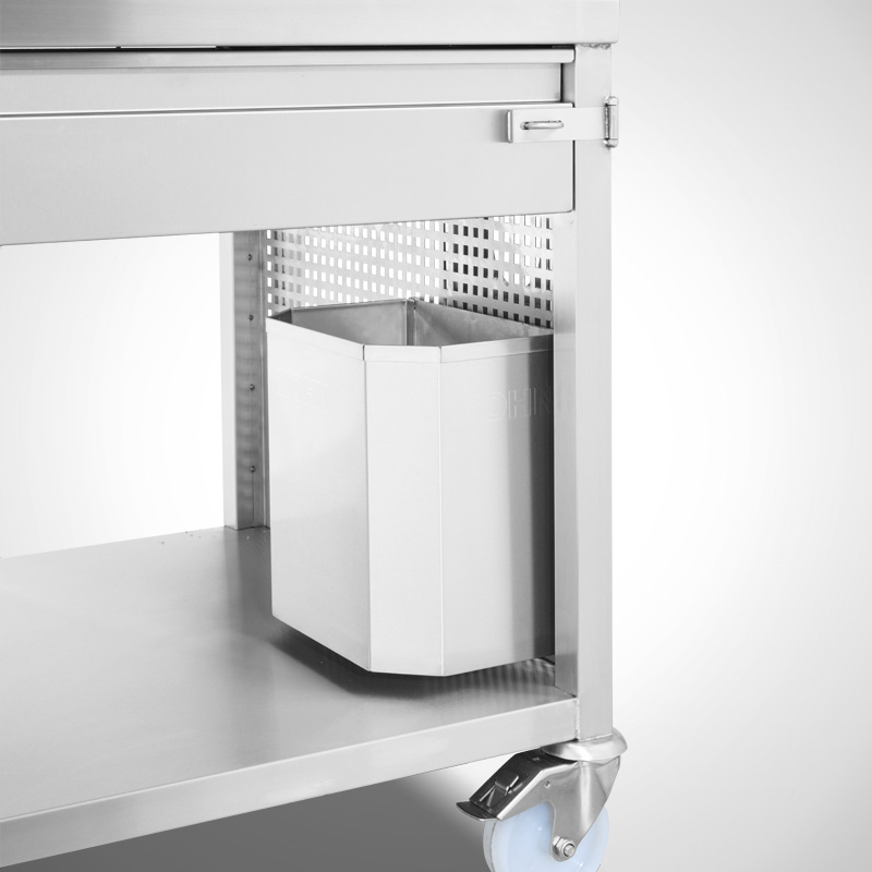 Unterseitig verstärkt eine Profilrahmenkonstruktion die Platte, eine Kabelöffnung Ø 50 mm hinten rechts ermöglicht sauberes Einführen von Messleitungen oder Stromversorgungen. Ordnung und Zugriff gelingen mit zwei untergebauten Kastenschubladen auf Vollauszügen (B 415 × T 500 × H 150 mm und B 650 × T 500 × H 150 mm); vorne mit Schlossriegel (Überfalle) und abschließbar mittels bauseitigem Vorhängeschloss. Ein verschweißter Ablageboden schafft Stauraum. Rechts unterstützt eine Lochwand mit 30-mm-Quadratlochung (B 700 × H 490 mm) die flexible Anordnung von Haken, Haltern und Körben – Prüfmittel sind damit strukturiert und griffbereit. Für klare Prozesse stehen eine abnehmbare DIN-A4-Dokumentenablage, ein Abfallbehälter (~17 l) sowie eine höhenverstellbare Halterung für 5 Sichttafeln bereit; die Position lässt sich ergonomisch auf die Bedienergröße einstellen.