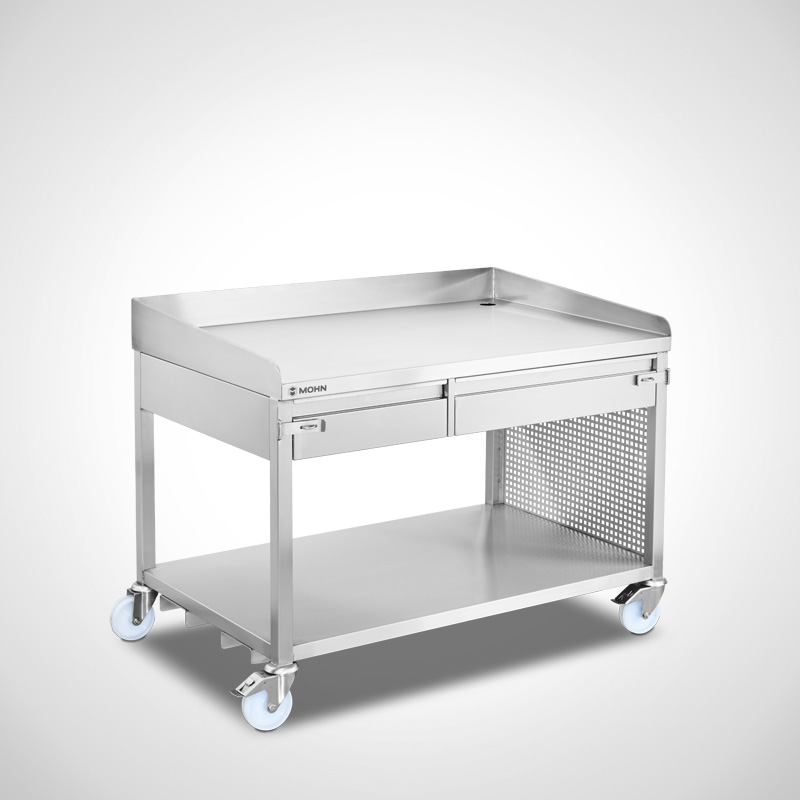 Mobilität ohne Kompromisse: Das Gestell aus Vierkant-Profilrahmen 40 × 40 × 1,5 mm läuft auf 2 Lenkrollen mit Feststeller und 2 Bockrollen aus Polyamid (Ø 125 mm) – leichtgängig, spurtreu und sicher fixierbar. U-Profile unter dem Ablageboden erlauben das rasche Umsetzen per Flurförderzeug, die Bodenfreiheit von 160 mm erleichtert die Reinigung unter dem Tisch.