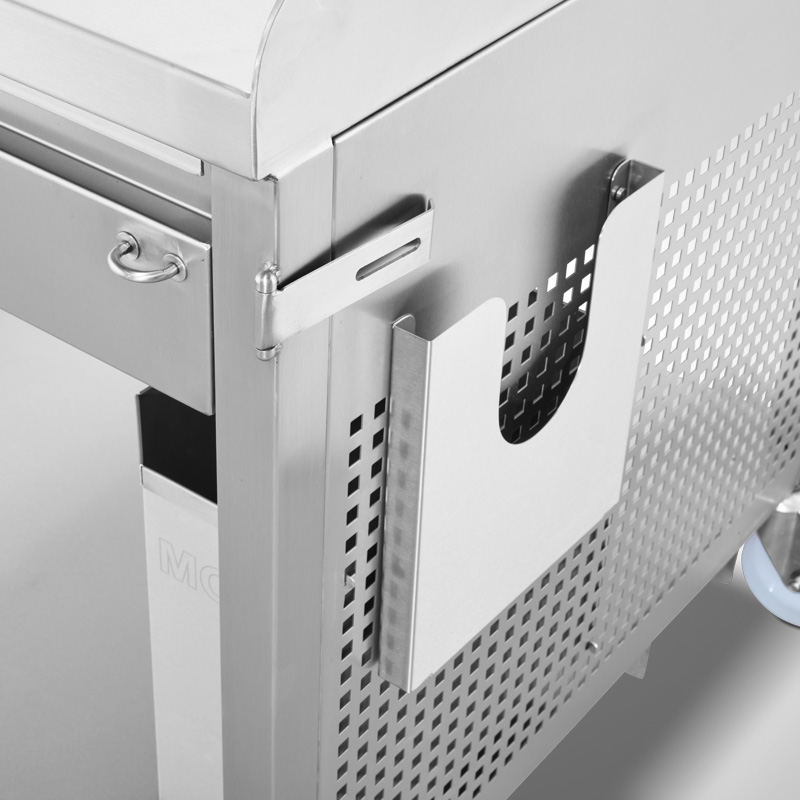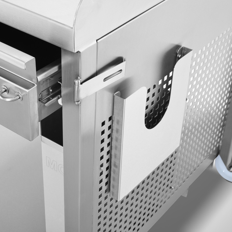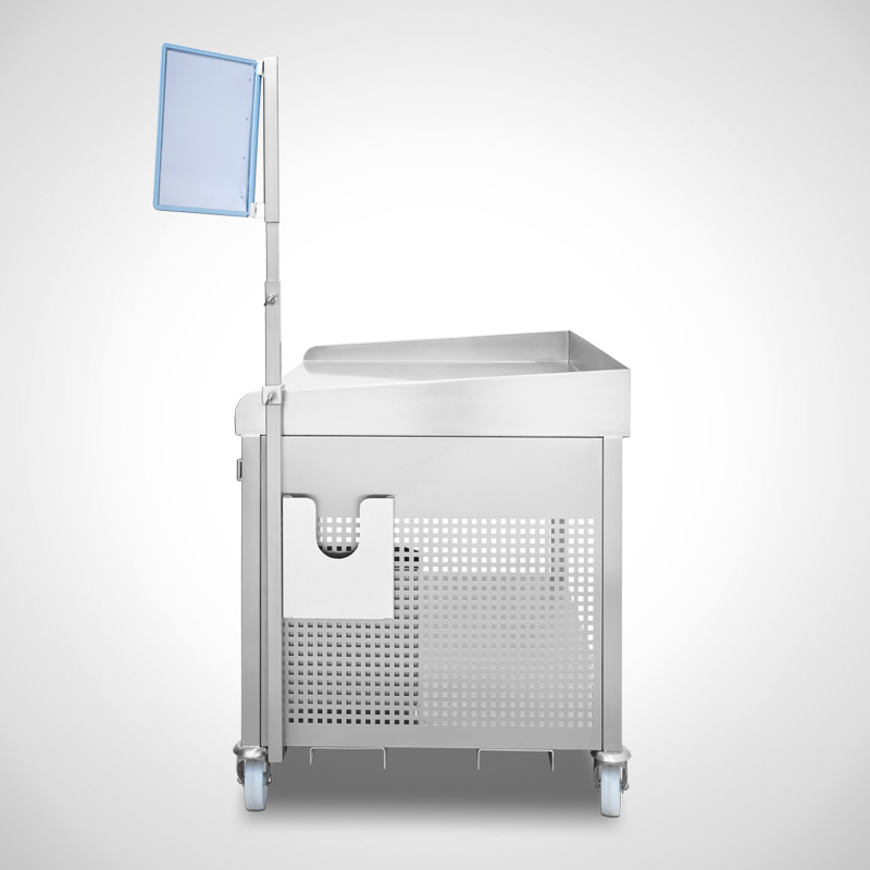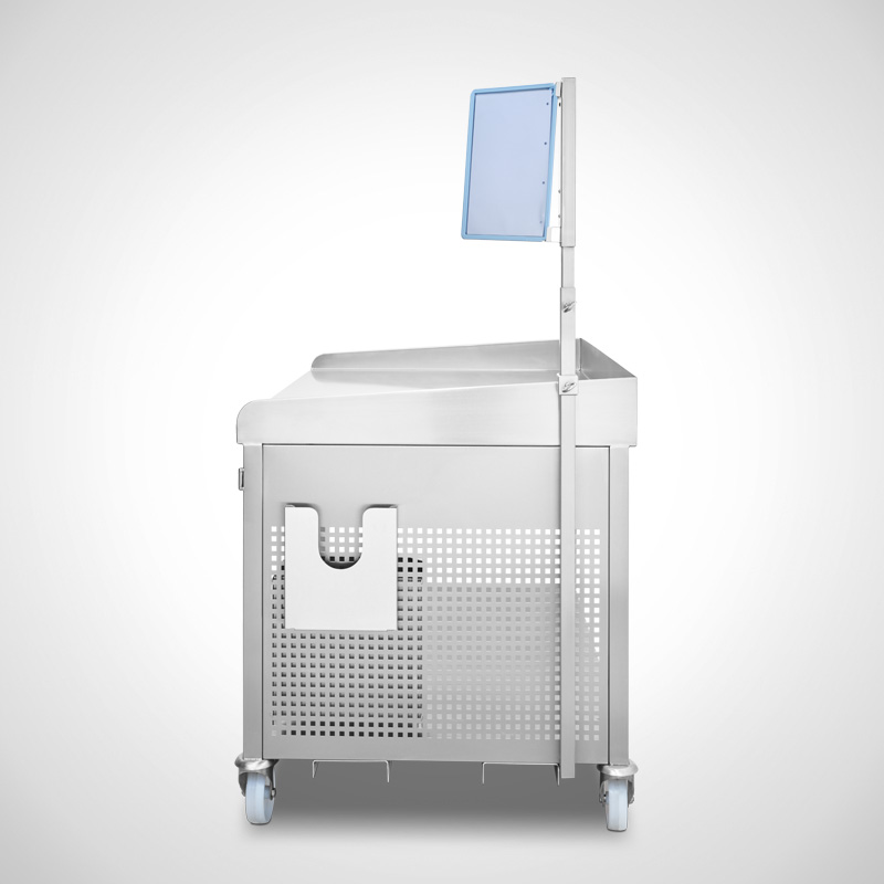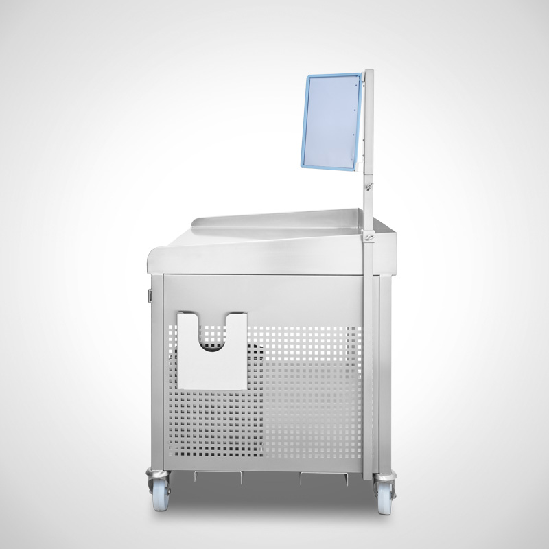 - Hygiene & Reinigung: Dreiseitige 100-mm-Aufkantung sichert das Prüfgut und erleichtert die Nassreinigung; glatte Edelstahlflächen, gut zugänglich.
