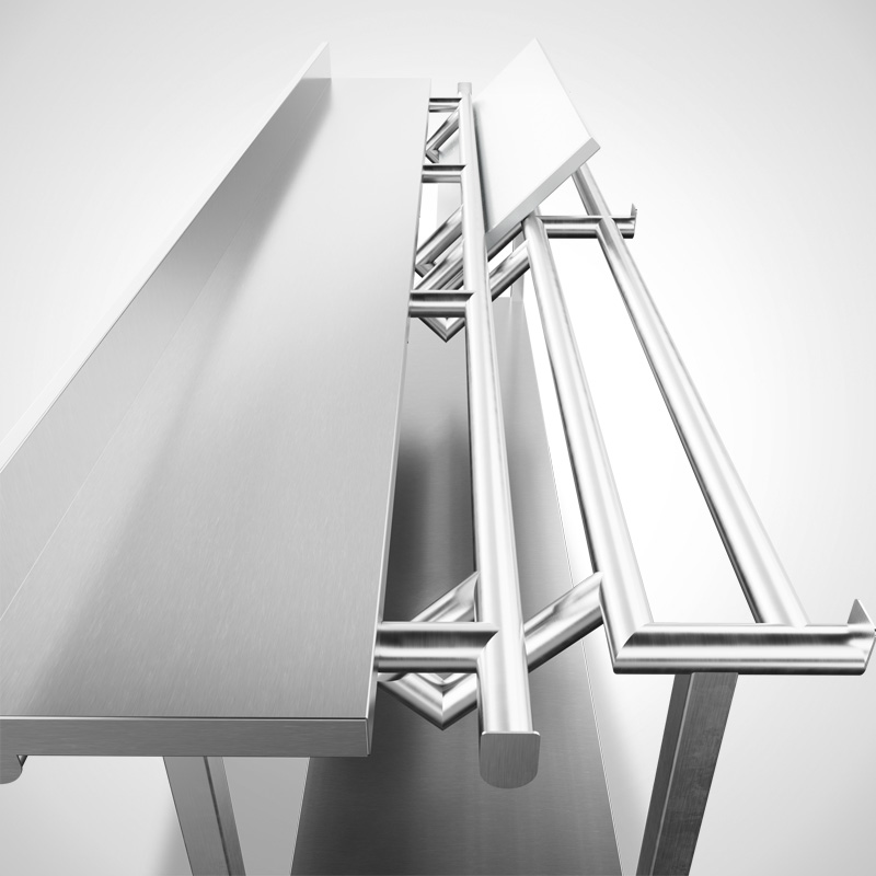 Die außen sichtbaren Edelstahlprofil-Oberflächen, wie z. B. Tischbeine haben einheitlich das Finish geburstet